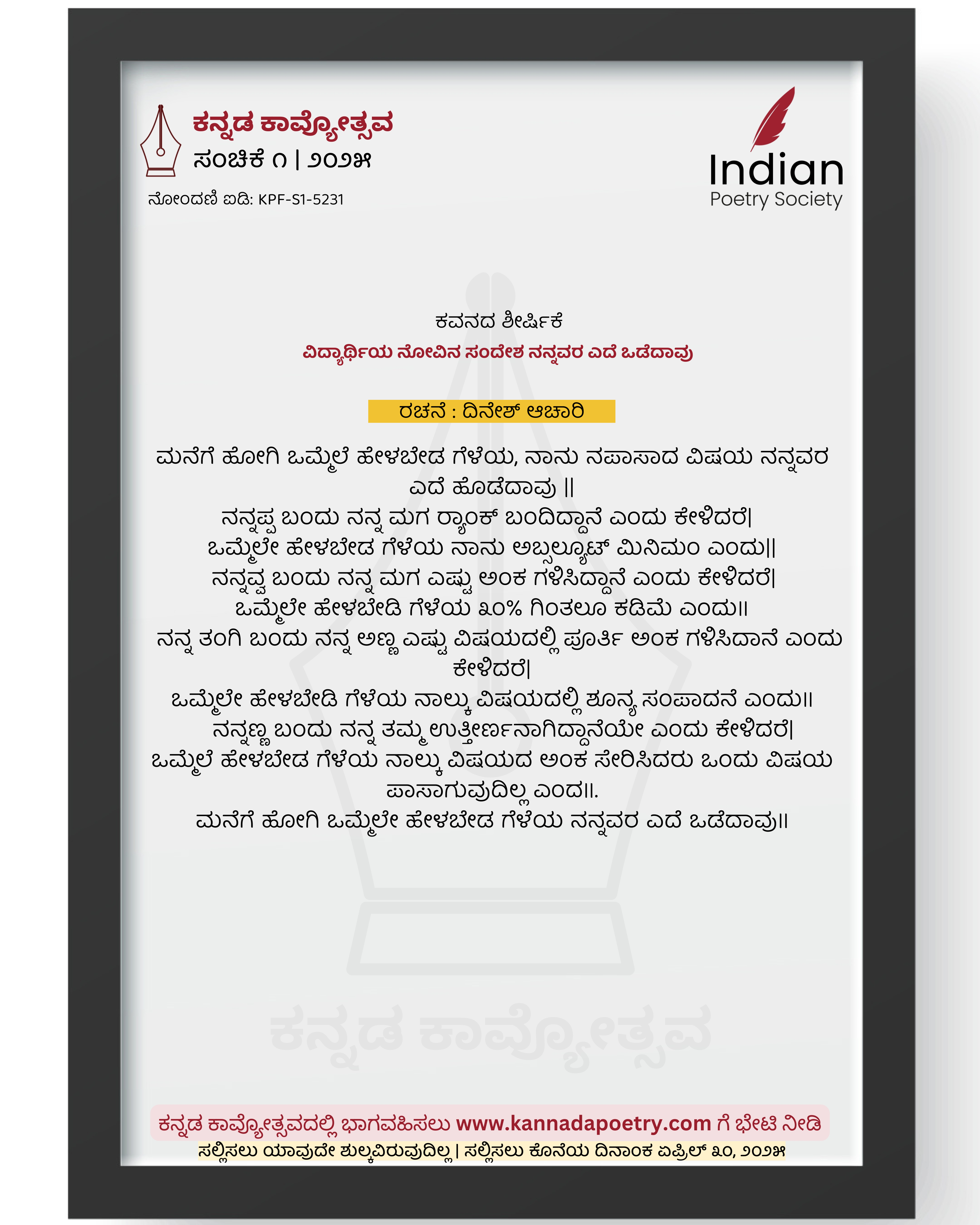 ಮನೆಗೆ ಹೋಗಿ ಒಮ್ಮೆಲೆ ಹೇಳಬೇಡ ಗೆಳೆಯ, ನಾನು ನಪಾಸಾದ ವಿಷಯ ನನ್ನವರ ಎದೆ ಹೊಡೆದಾವು || ನನ್ನಪ್ಪ ಬಂದು ನನ್ನ ಮಗ ರ್ಯಾಂಕ್ ಬಂದಿದ್ದಾನೆ ಎಂದು ಕೇಳಿದರೆ| ಒಮ್ಮೆಲೇ ಹೇಳಬೇಡ ಗೆಳೆಯ ನಾನು ಅಬ್ಸಲ್ಯೂಟ್ ಮಿನಿಮಂ ಎಂದು|| ನನ್ನವ್ವ ಬಂದು ನನ್ನ ಮಗ ಎಷ್ಟು ಅಂಕ ಗಳಿಸಿದ್ದಾನೆ ಎಂದು ಕೇಳಿದರೆ| ಒಮ್ಮೆಲೇ ಹೇಳಬೇಡಿ ಗೆಳೆಯ ೩೦% ಗಿಂತಲೂ ಕಡಿಮೆ ಎಂದು॥ ನನ್ನ ತಂಗಿ ಬಂದು ನನ್ನ ಅಣ್ಣ ಎಷ್ಟು ವಿಷಯದಲ್ಲಿ ಪೂರ್ತಿ ಅಂಕ ಗಳಿಸಿದಾನೆ ಎಂದು ಕೇಳಿದರೆ| ಒಮ್ಮೆಲೇ ಹೇಳಬೇಡಿ ಗೆಳೆಯ ನಾಲ್ಕು ವಿಷಯದಲ್ಲಿ ಶೂನ್ಯ ಸಂಪಾದನೆ ಎಂದು॥ ನನ್ನಣ್ಣ ಬಂದು ನನ್ನ ತಮ್ಮ ಉತ್ತೀರ್ಣನಾಗಿದ್ದಾನೆಯೇ ಎಂದು ಕೇಳಿದರೆ| ಒಮ್ಮೆಲೆ ಹೇಳಬೇಡ ಗೆಳೆಯ ನಾಲ್ಕು ವಿಷಯದ ಅಂಕ ಸೇರಿಸಿದರು ಒಂದು ವಿಷಯ ಪಾಸಾಗುವುದಿಲ್ಲ ಎಂದ॥. ಮನೆಗೆ ಹೋಗಿ ಒಮ್ಮೆಲೇ ಹೇಳಬೇಡ ಗೆಳೆಯ ನನ್ನವರ ಎದೆ ಒಡೆದಾವು॥
