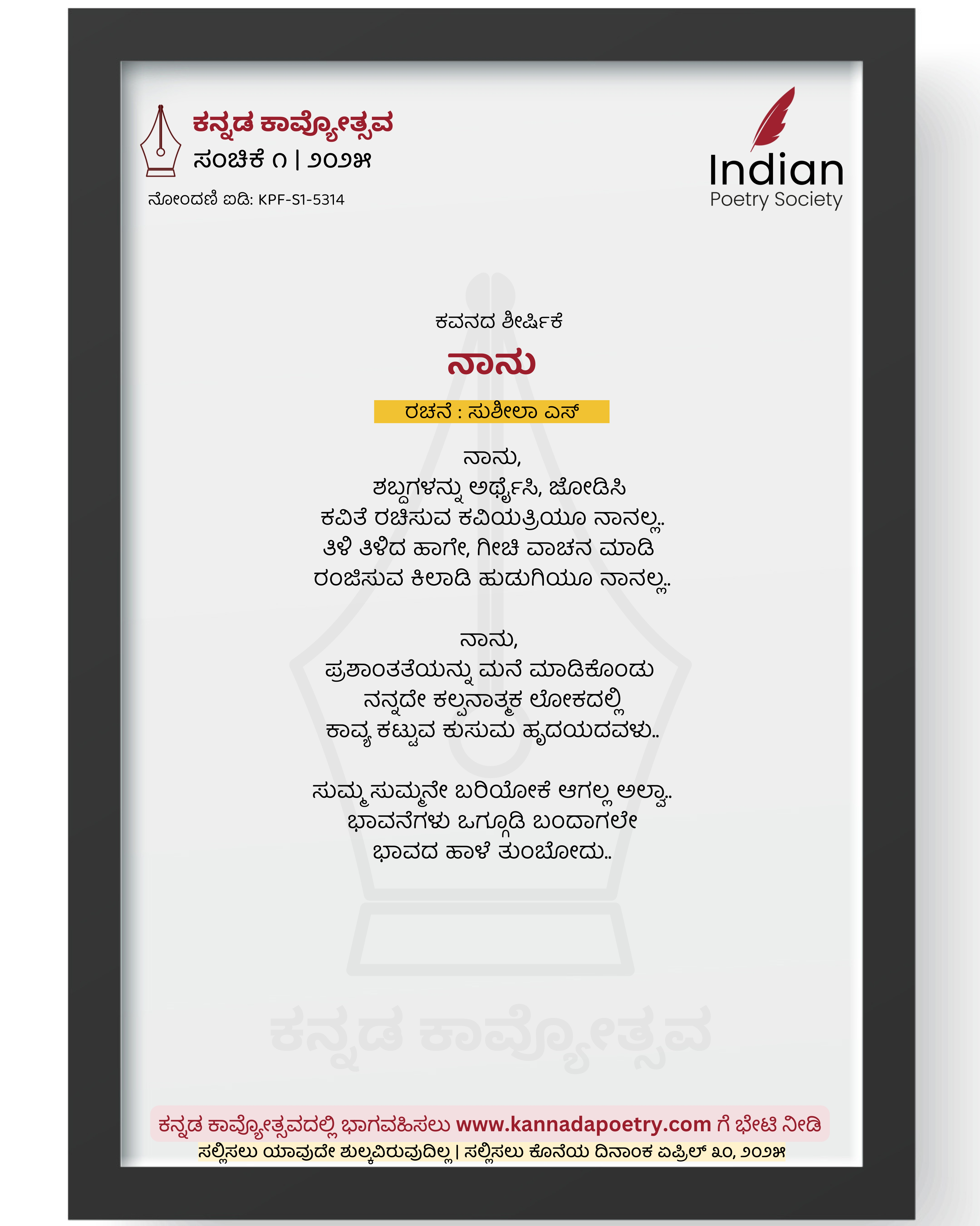 ನಾನು, ಶಬ್ದಗಳನ್ನು ಅರ್ಥೈಸಿ, ಜೋಡಿಸಿ ಕವಿತೆ ರಚಿಸುವ ಕವಿಯತ್ರಿಯೂ ನಾನಲ್ಲ.. ತಿಳಿ ತಿಳಿದ ಹಾಗೇ, ಗೀಚಿ ವಾಚನ ಮಾಡಿ ರಂಜಿಸುವ ಕಿಲಾಡಿ ಹುಡುಗಿಯೂ ನಾನಲ್ಲ.. ನಾನು, ಪ್ರಶಾಂತತೆಯನ್ನು ಮನೆ ಮಾಡಿಕೊಂಡು ನನ್ನದೇ ಕಲ್ಪನಾತ್ಮಕ ಲೋಕದಲ್ಲಿ ಕಾವ್ಯ ಕಟ್ಟುವ ಕುಸುಮ ಹೃದಯದವಳು.. ಸುಮ್ಮ ಸುಮ್ಮನೇ ಬರಿಯೋಕೆ ಆಗಲ್ಲ ಅಲ್ವಾ.. ಭಾವನೆಗಳು ಒಗ್ಗೂಡಿ ಬಂದಾಗಲೇ ಭಾವದ ಹಾಳೆ ತುಂಬೋದು..