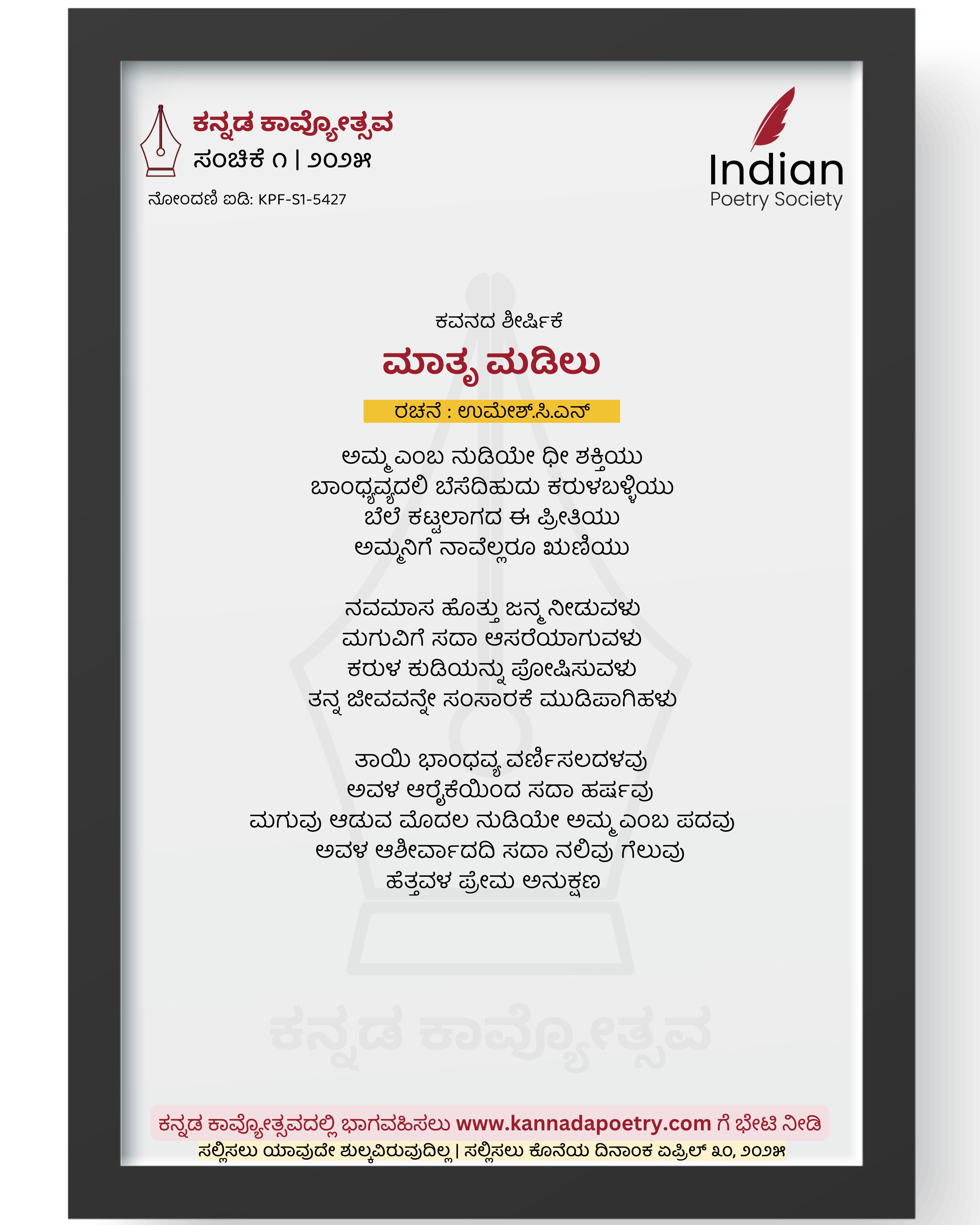 ಅಮ್ಮ ಎಂಬ ನುಡಿಯೇ ಧೀ ಶಕ್ತಿಯು ಬಾಂಧ್ಯವ್ಯದಲಿ ಬೆಸೆದಿಹುದು ಕರುಳಬಳ್ಳಿಯು ಬೆಲೆ ಕಟ್ಟಲಾಗದ ಈ ಪ್ರೀತಿಯು ಅಮ್ಮನಿಗೆ ನಾವೆಲ್ಲರೂ ಋಣಿಯು ನವಮಾಸ ಹೊತ್ತು ಜನ್ಮ ನೀಡುವಳು ಮಗುವಿಗೆ ಸದಾ ಆಸರೆಯಾಗುವಳು ಕರುಳ ಕುಡಿಯನ್ನು ಪೋಷಿಸುವಳು ತನ್ನ ಜೀವವನ್ನೇ ಸಂಸಾರಕೆ ಮುಡಿಪಾಗಿಹಳು ತಾಯಿ ಭಾಂಧವ್ಯ ವರ್ಣಿಸಲದಳವು ಅವಳ ಆರೈಕೆಯಿಂದ ಸದಾ ಹರ್ಷವು ಮಗುವು ಆಡುವ ಮೊದಲ ನುಡಿಯೇ ಅಮ್ಮ ಎಂಬ ಪದವು ಅವಳ ಆಶೀರ್ವಾದದಿ ಸದಾ ನಲಿವು ಗೆಲುವು ಹೆತ್ತವಳ ಪ್ರೇಮ ಅನುಕ್ಷಣ