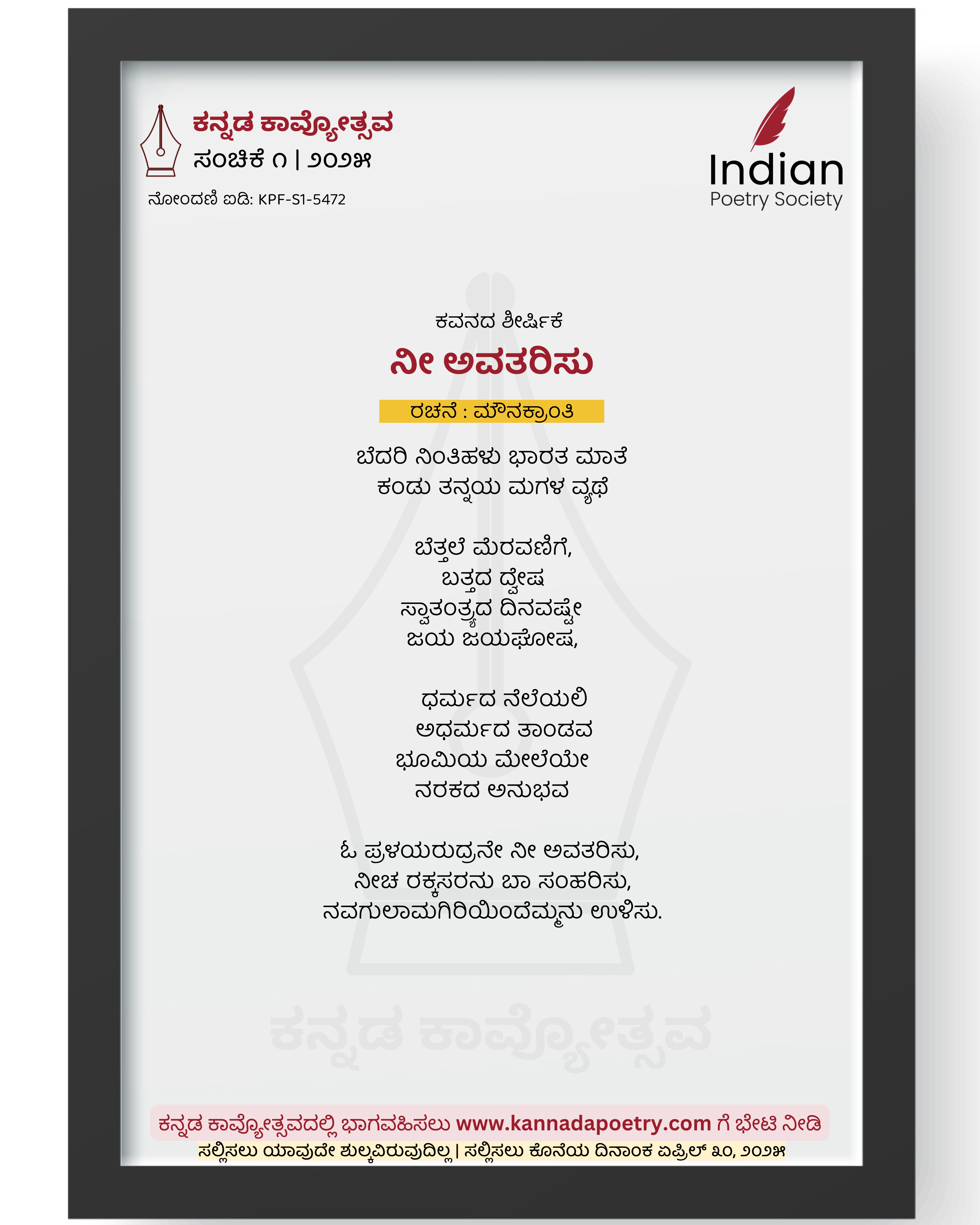 ಬೆದರಿ ನಿಂತಿಹಳು ಭಾರತ ಮಾತೆ ಕಂಡು ತನ್ನಯ ಮಗಳ ವ್ಯಥೆ ಬೆತ್ತಲೆ ಮೆರವಣಿಗೆ, ಬತ್ತದ ದ್ವೇಷ ಸ್ವಾತಂತ್ರ್ಯದ ದಿನವಷ್ಟೇ ಜಯ ಜಯಘೋಷ, ಧರ್ಮದ ನೆಲೆಯಲಿ ಅಧರ್ಮದ ತಾಂಡವ ಭೂಮಿಯ ಮೇಲೆಯೇ ನರಕದ ಅನುಭವ ಓ ಪ್ರಳಯರುದ್ರನೇ ನೀ ಅವತರಿಸು, ನೀಚ ರಕ್ಕಸರನು ಬಾ ಸಂಹರಿಸು, ನವಗುಲಾಮಗಿರಿಯಿಂದೆಮ್ಮನು ಉಳಿಸು.
